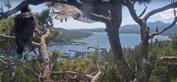 I’ve mentioned this nest before, and now there’s an update — California's most famous bald eagle family hit a major milestone this week when one of Jackie and Shadow's eaglets took her first flight from their Big Bear nest. Sunny made her debut at 10:46 a.m. Monday, leaping from a branch and flapping away while thousands of viewers watched via the live eagle cam that's become "one of the coziest corners of the internet." Her sister Gizmo remains in the nest, developing at her own pace—a reminder that even among siblings, every eagle's timeline is different. At nearly 13 weeks old, both eaglets are right on schedule for fledging season, having spent days practicing wing-flapping and branch-hopping in preparation for this moment. The sisters will likely stick around the area for another 1-3 months, popping in and out of the nest as they build confidence, before eventually striking out on their own by fall.
